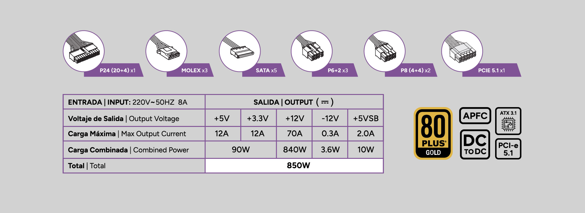 Posee la Certificación 80 Plus Gold y tecnologías DC-DC y SMD, asegurando alta eficiencia energética, funcionamiento estable y una calidad y durabilidad superiores.